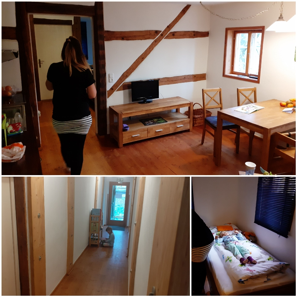Ein wunderschön Wohnbereich im sanierten Fachwerk. Taleja hat schon den Spiele-Schrank im Flur entdeckt und auch der Mittagsschlaf wurde mit Freude erwartet im Urlaubsbettchen. Nur Leo ist mit anderen Betten noch recht wählerisch.