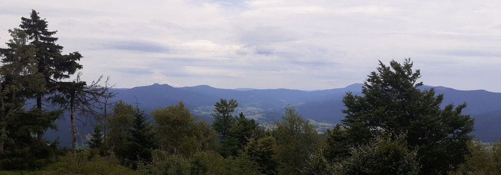 Blick nach Deutschland. Am rechten Baumwipfel der große Arber, höchster Berg im bayerischen Wald.