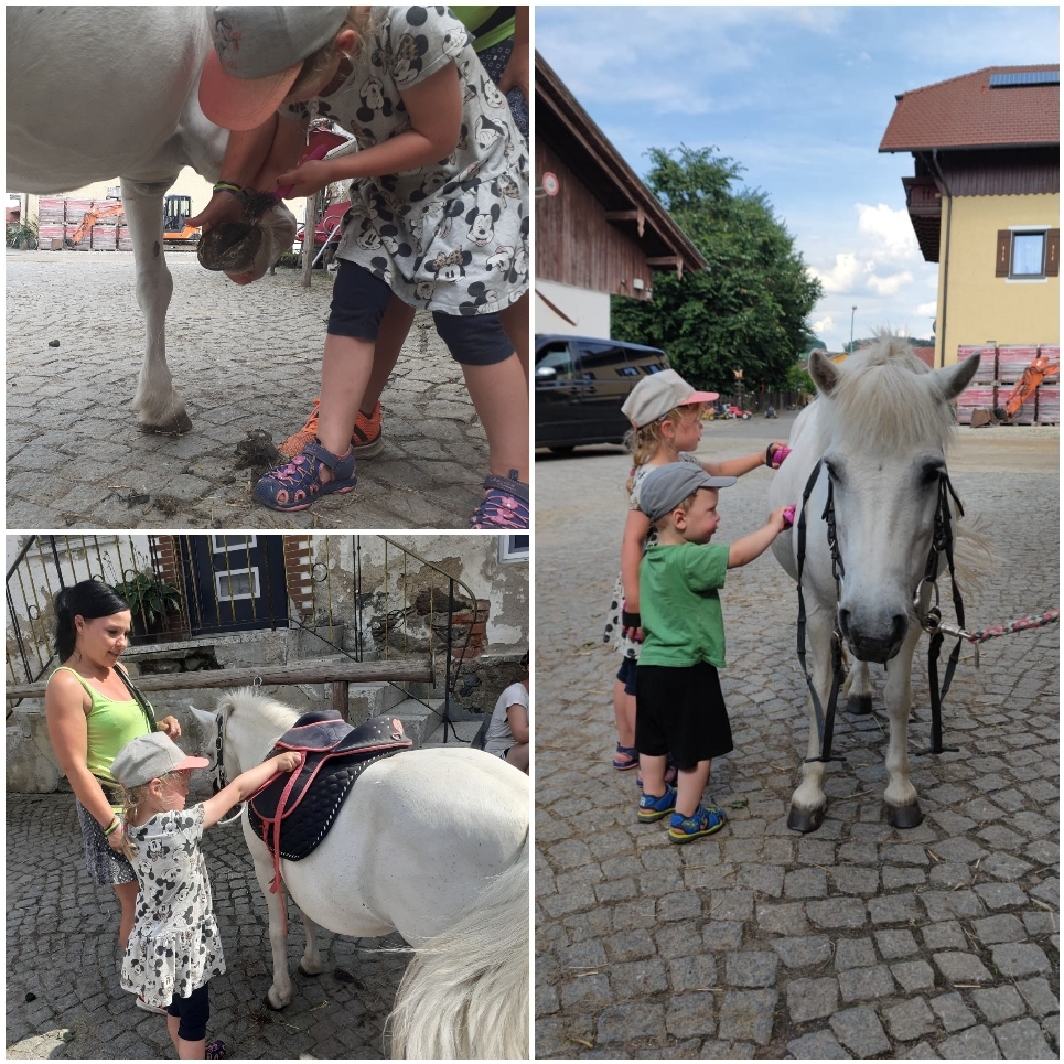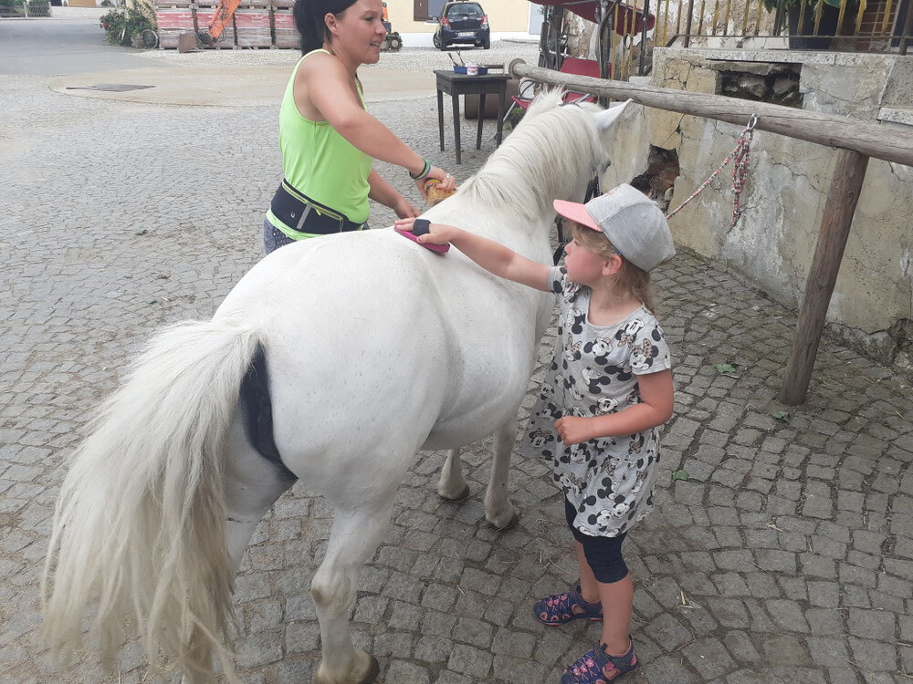 Zurück auf dem Bauernhof gab es gleich wieder eine Reitstunde von Anne. Leo hat auch seine ersten Handgriffe gelernt.